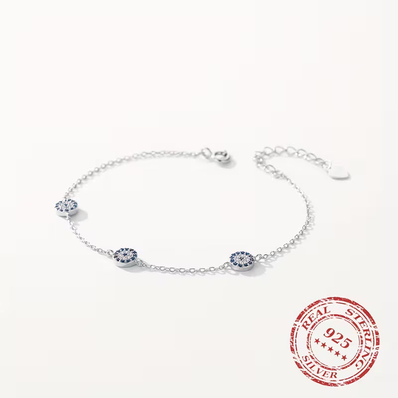 Triple the sparkle, triple the protection. The 925 Sterling Silver Three Evil Eye Bracelet features a stunning trio of evil eye charms — each one symbolizing clarity, shielding, and positive energy. Surrounded by shimmering cubic zirconia stones and set on a refined sterling silver chain, this bracelet delivers a radiant blend of beauty and meaning.